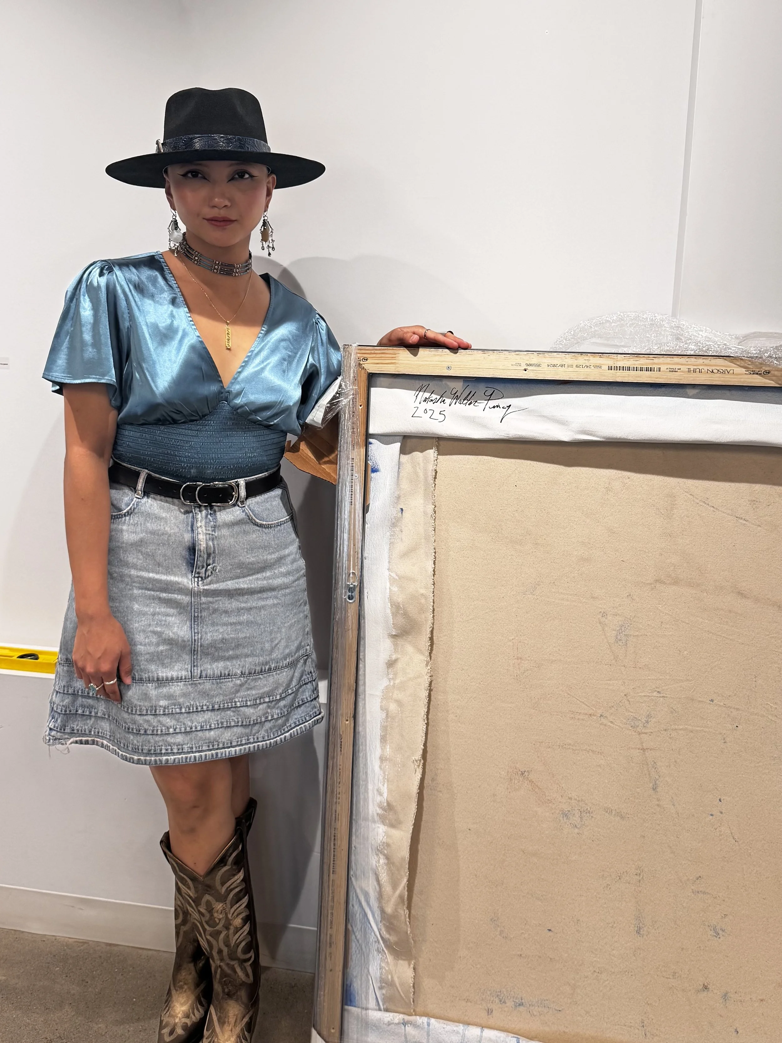 Contemporary Indigenous-Canadian painter and jeweller, Natasha Walter-Pinay (b. 2003), focuses her theme on navigating the complexities of belonging to multiple identities and the feeling of not being able to truly connect to either as a result of past and current events. Natasha primarily works in oil paint on canvas, taking traditional painting techniques into a contemporary context through semi-abstraction and the displacement, obscurement, or erasure of figures. Natasha has a Bachelor of Fine Arts degree in painting from the Alberta University of the Arts (AUArts) in Calgary, Alberta, where she also participated in the the 2024 AUArts Summer Residency, and received the Osler Hoskin & Harcourt LLP 2024 Indigenous Artists Award.